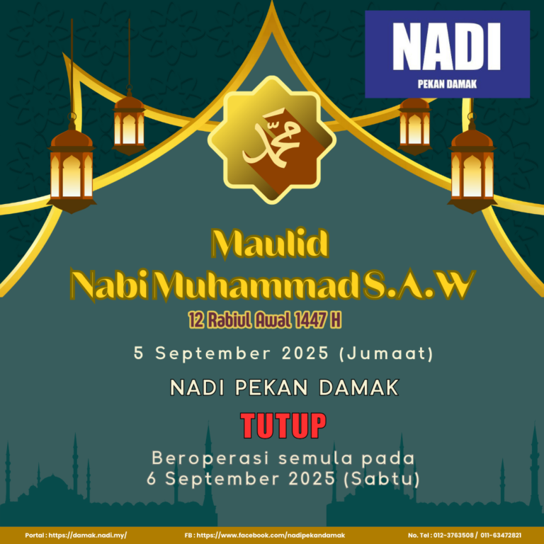 Tempat : Pusat Sebaran Maklumat Nasional (NADI) Pekan Damak Tarikh : 1 Ogos 2025 (Jumaat) Masa : 10:00 pagi – 12:00 tengah hari